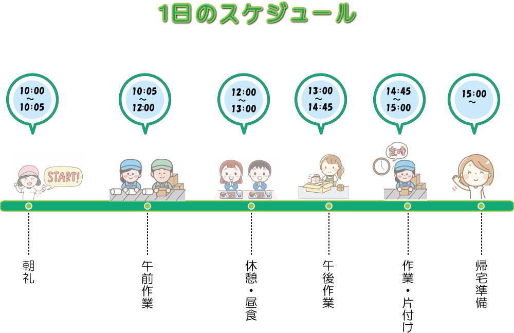 Q.働く時間はA.10時から15時のあいだです(休憩1時間)